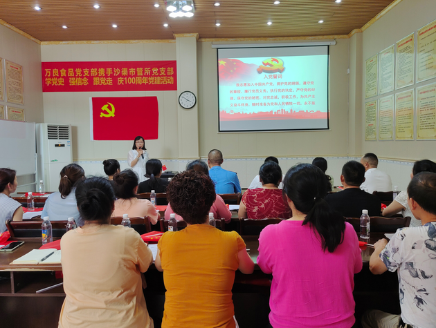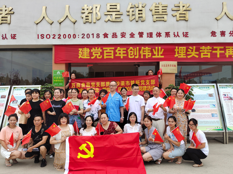 百年征程,世纪辉煌。为热烈庆祝中国共产党成立100周年,缅怀党的光辉历史,讴歌党的丰功伟绩,传承党的优良传统,发扬党的优良作风,万良食品携沙渠市管所党支部在我厂隆重举行系列庆祝活动。
